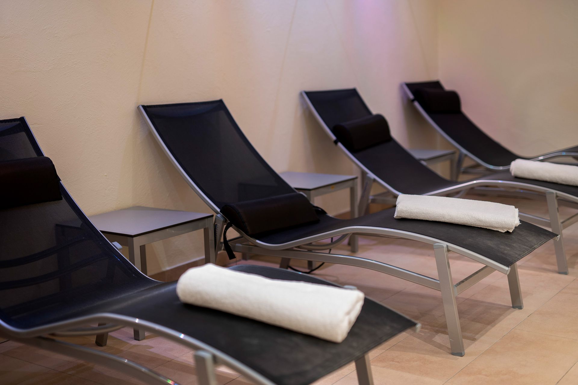 lädt zum Verweilen ein. Entspannen Sie nach dem ausgiebigem Saunabad auf körpergerecht geformten Ruheliegen.